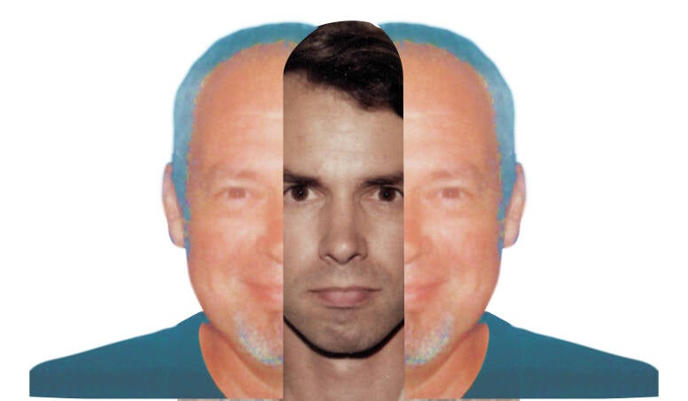 Ken's Photoshop creation, a curious view of himself as though a split person. A scowling boy inside a grinning man.